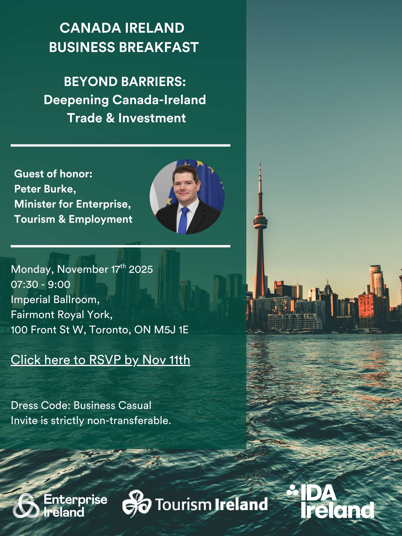 We are delighted to invite you to the Canada-Ireland Business Breakfast, sponsored by Tourism Ireland, IDA Ireland & Enterprise Ireland.